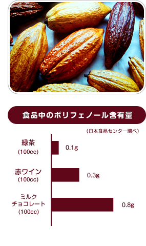 高カカオチョコ100グラムにはカカオポリフェノールが約2700ミリグラム含まれており、ポリフェノールがたっぷり含まれていることで知られる赤ワインの15倍にもなるといわれます。